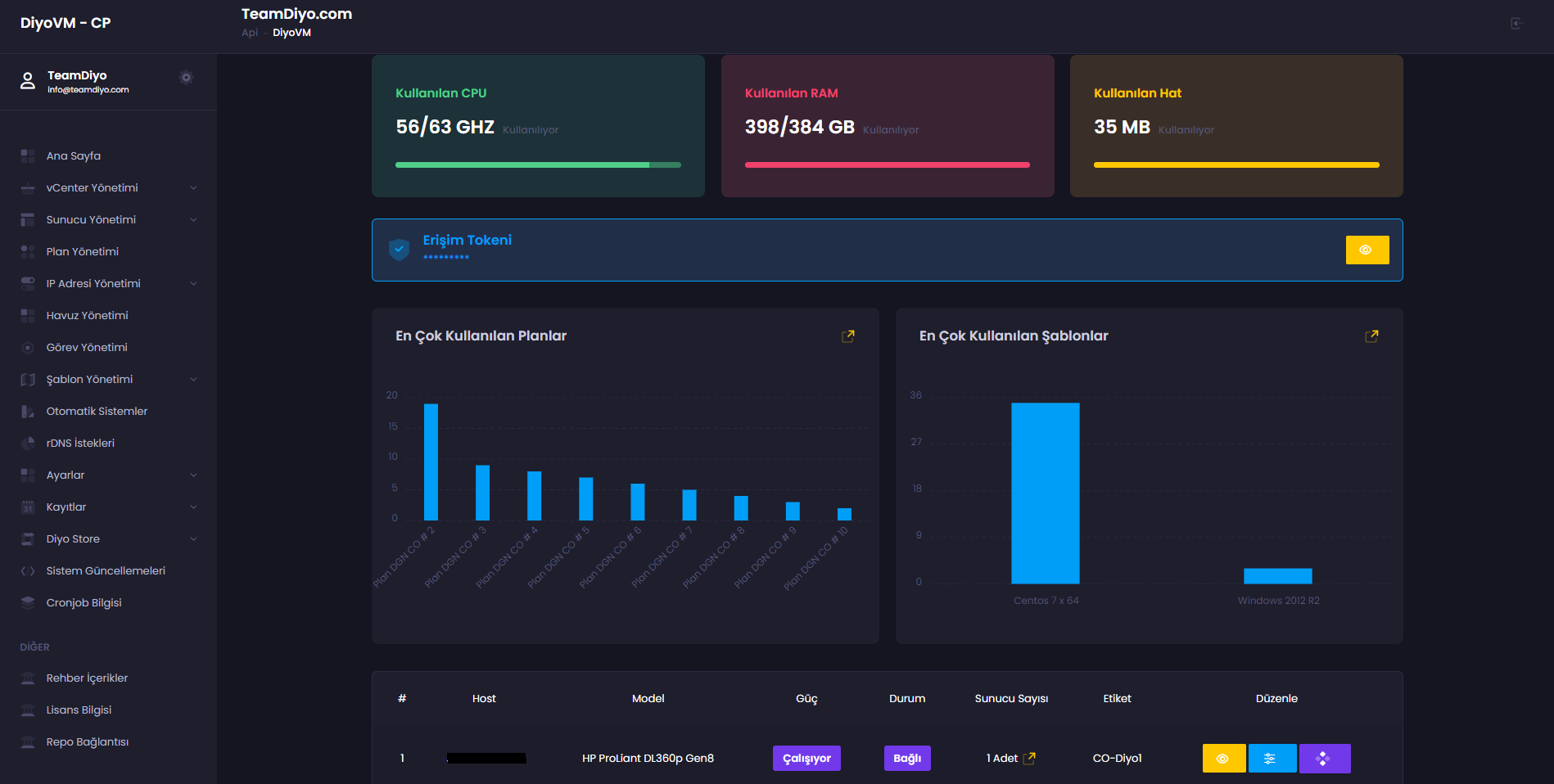 Her aşamada kontrol imkanıDiyoSoftware, DiyoVM Servislerinde her aşamada her konuda tüm yönetimi ve takibi sizlerin yapabilmesi için ileri seviye yazılım alt yapıları sunmaktadır. Satış grafiklerinizi, en çok kullanılan paketlerinizi, işletim sistemi istatisliklerini, envanter takibi için IPv4 ve Sunucu istatisliklerini her kademede detaylı olmak şartı ile sizlere ücretsiz sunmaktadır. DiyoVM ile müşteri memnuniyetinizi arttırarak satış gelirlerinizi arttırmak artık sizin elinizde!